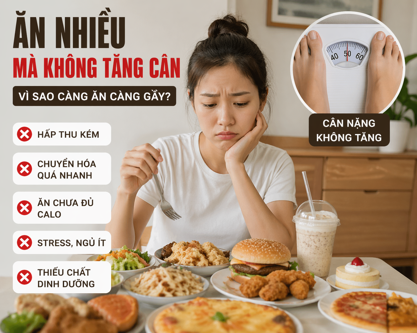 Thiếu cân là vấn đề nan giải trong nhiều người, nó không chỉ là chuyện đẹp – xấu mà còn là câu chuyện sức khỏe và sự tự tin. Hàng ngày, bạn vẫn đang chật vật với những bữa ăn, dù bạn đã ăn nhiều mà vẫn khó khăn trong vấn đề tăng cân. Vậy tại sao bạn vẫn gầy? Nguyên nhân có thể là do thói quen sinh hoạt, di truyền hoặc có nhiều lí do tác động khác thậm chí là vấn đề bệnh lý.